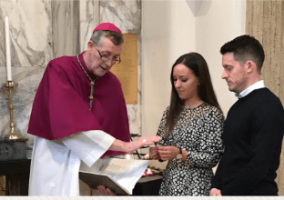 Bishop Denis blesses an engaged couple at the Shrine of...